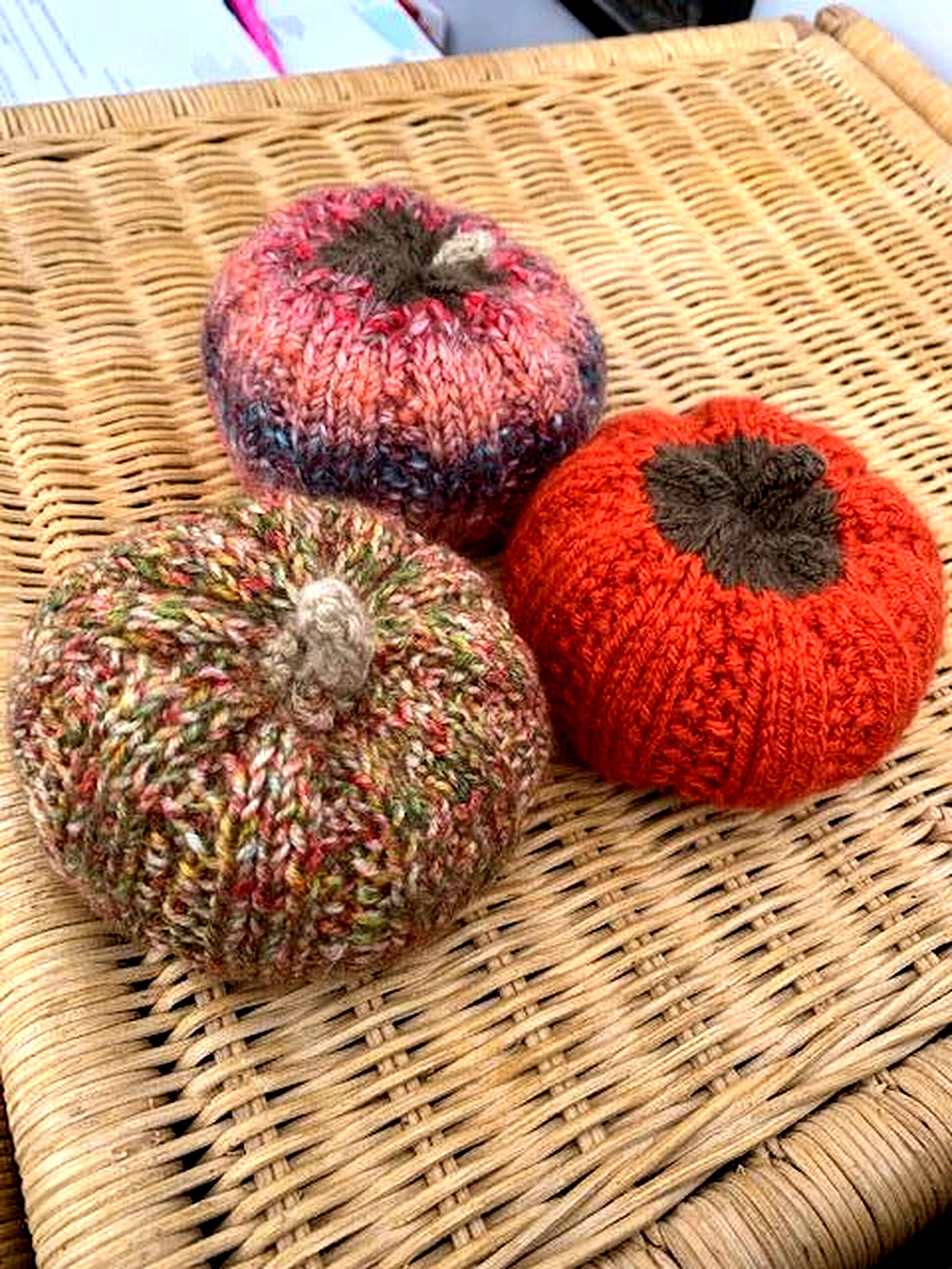 I used a variety of coloureddouble knit and chunky wool that I had left over. Including a couple using some variegated wool which created some lovely shaded pumpkins in a range of autumnal coloursand sizes to make my pumpkin patch. You can knit and stuff them with toy stuffing or if you can't get this , then you could use old socks or tights as alternate stuffing.