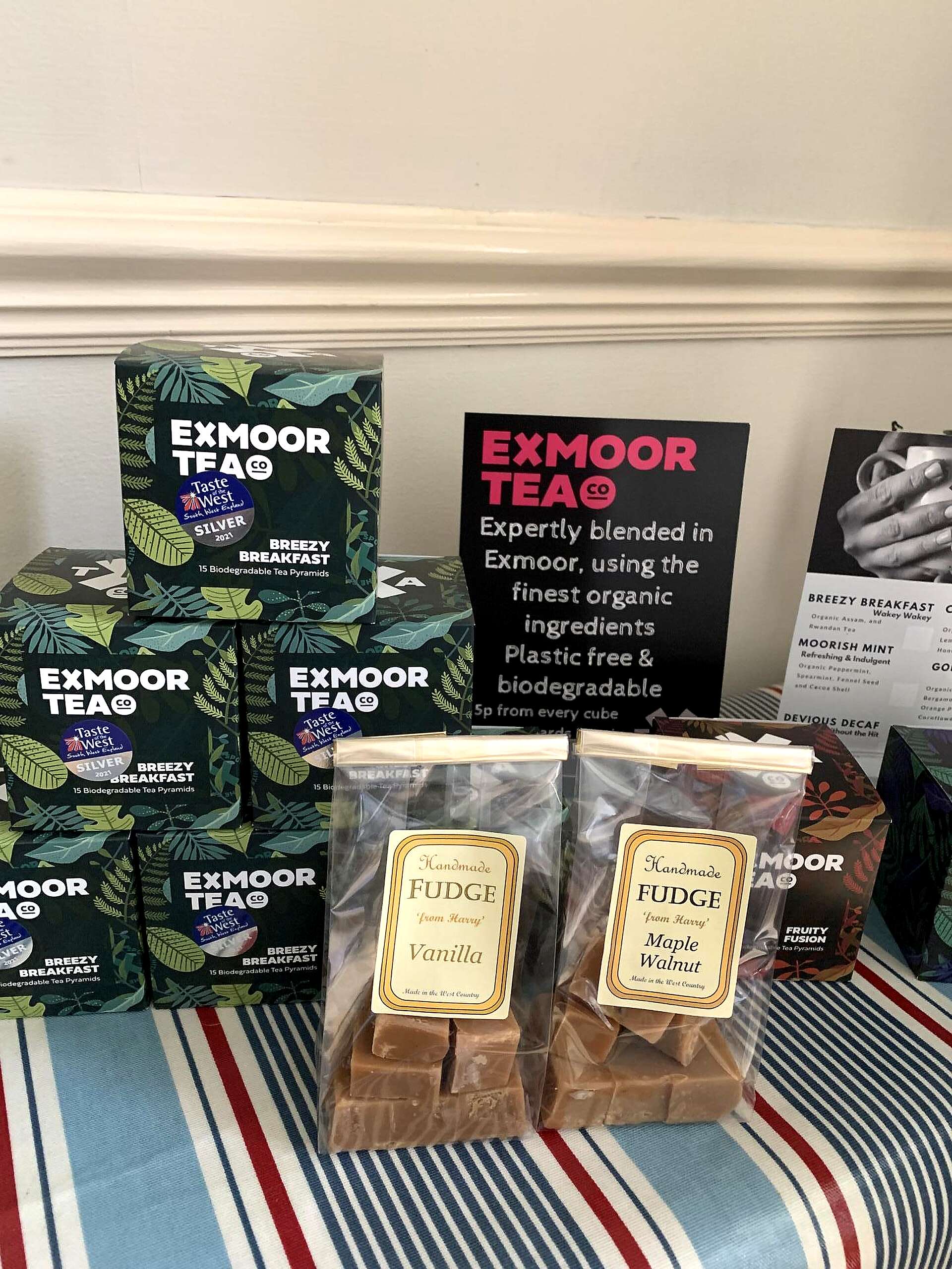 If you don't drink alcohol then you will find Exmoor Tea company based at Dulverton. We use these at breakfast and in the rooms, so that all our guests can try the special and unique range of blended teas that are ethically sourced and have plastic free packaging which also supports our sustainability pledge and taste great.