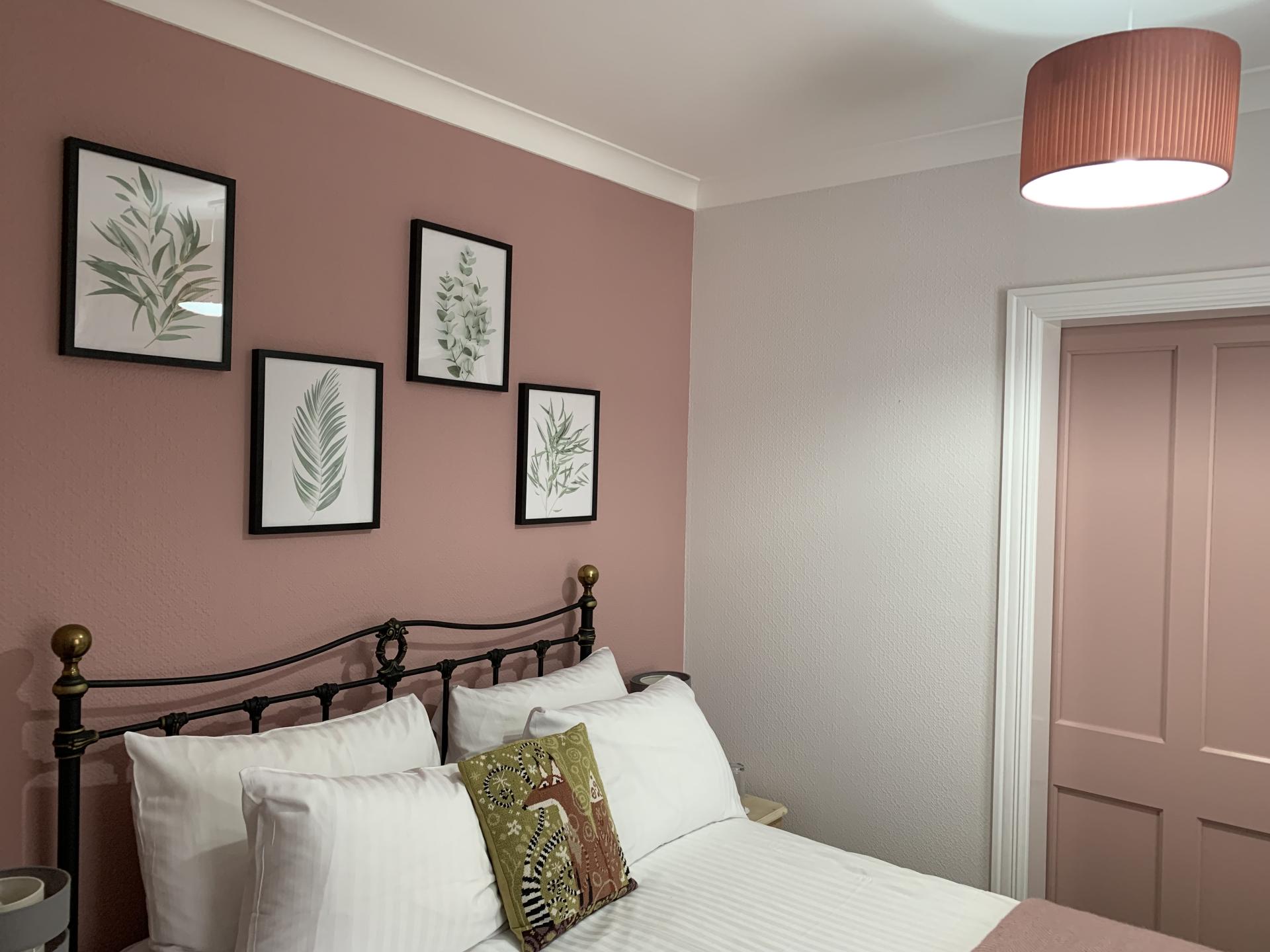 This front facing room located on the First floor has a metal framed double bed and an en suite shower room. Features also include original sash windows and views of the front garden and of Hollerday Hill opposite. It is tastefully decorated and compact yet very well equipped. Two active people will find this room comfortable for a short stay .
