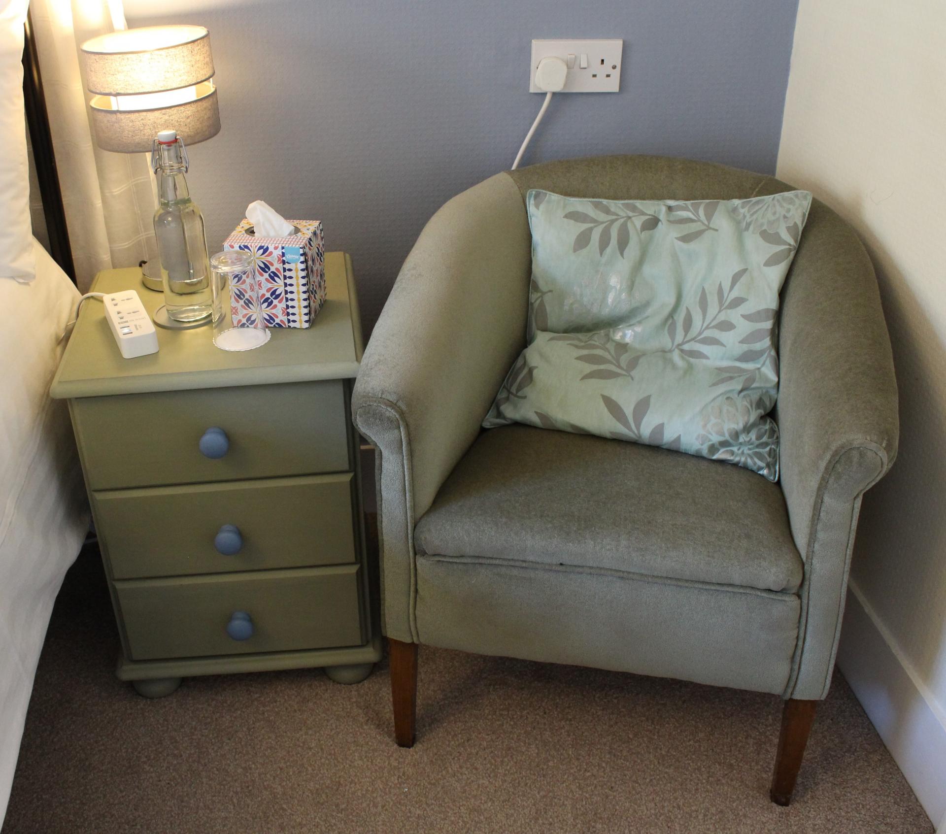 On the Second floor this front facing Superior double room has been redecorated for 2020 season.This room has a large metal framed King size bed, with memory foam mattress for a luxurious and comfortable sleep. We have painted a feature wall and upcycled some of the furniture in colours sympathetic to the Victorian character of the house. We have added a comfortable tub chair to relax in, as well as replacing the side lamps and curtains. The en-suite bathroom has a bath with handheld shower attachment for washing your hair. The bathroom has a low sloping ceiling and therefore the shower can only be used seated in the bath. Indulge in a long soak in comfort in the bath using the complementary toiletries after a full day exploring.